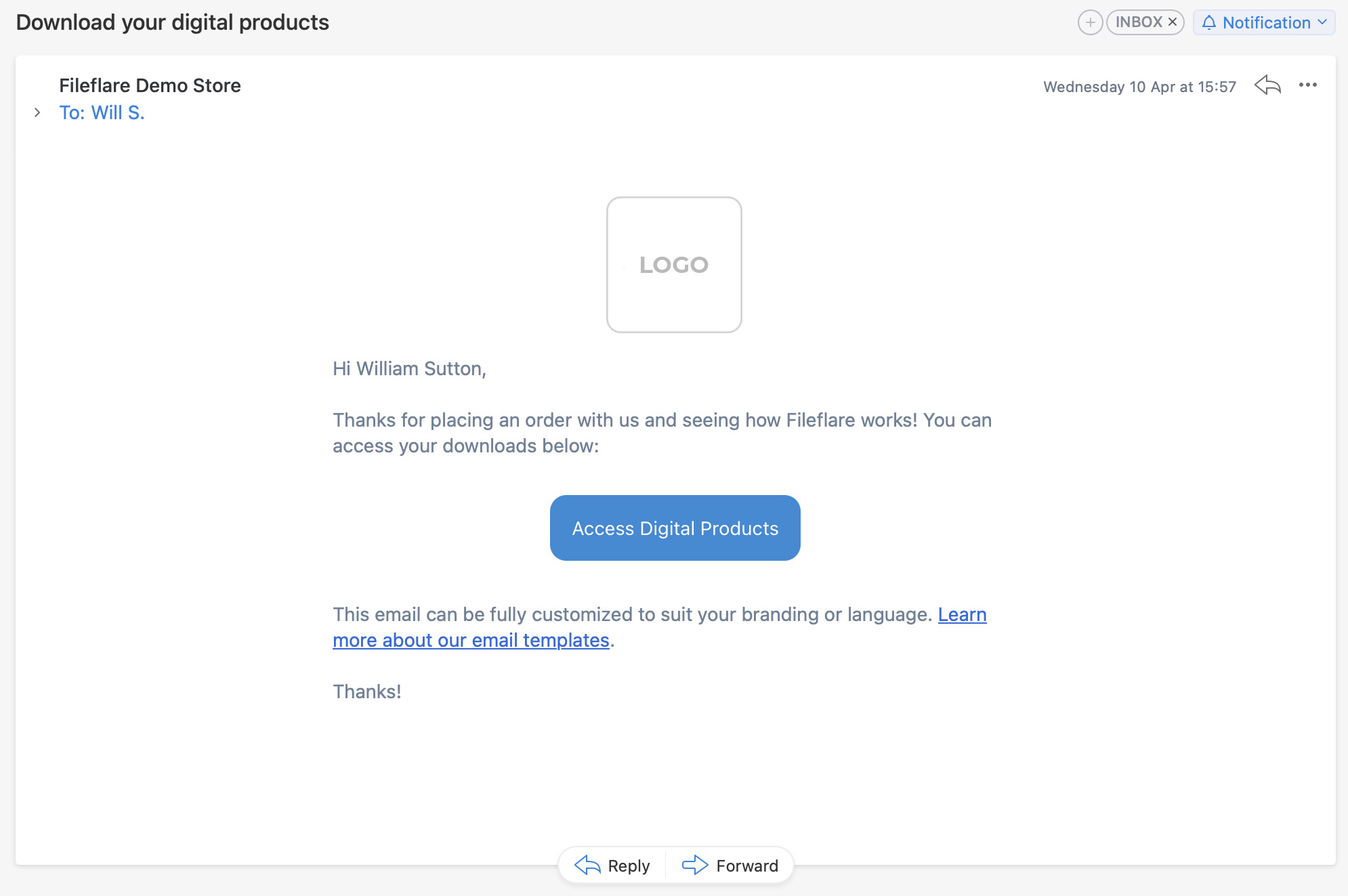 Fileflare will send download emails to your customers.